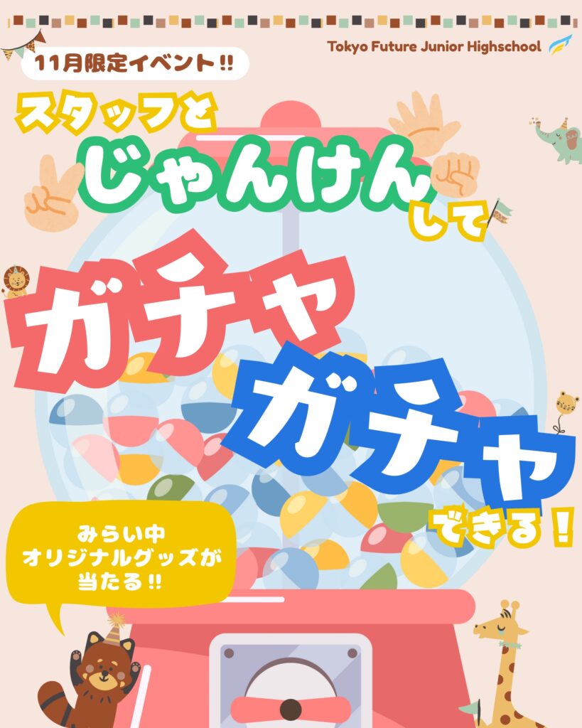 スタッフと「じゃんけん」をして、ポイントをためて、ガチャガチャに挑戦✨みらい中オリジナルグッズがあたります!ぜひこの機会にいろんなスタッフとお話をしてみてくださいね♪