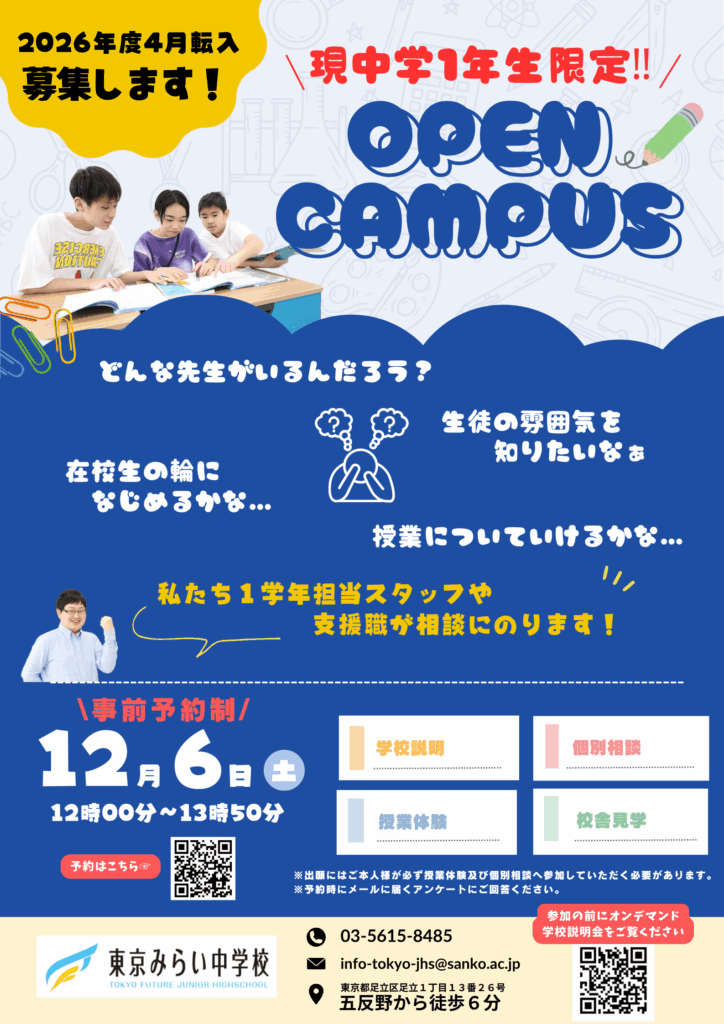 2026年度入学試験に出願するには、オープンキャンパスのプログラムである授業体験と個別相談の両方に志願者本人が参加する必要があります。