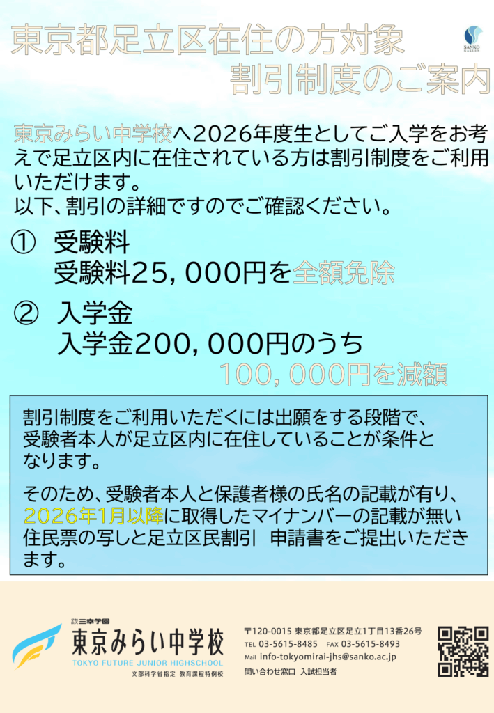 また、東京みらい中学校へのご入学をお考えで足立区内に在住されている方を対象とした、入学検定料・入学金の割引制度もございますので、併せてご覧ください。