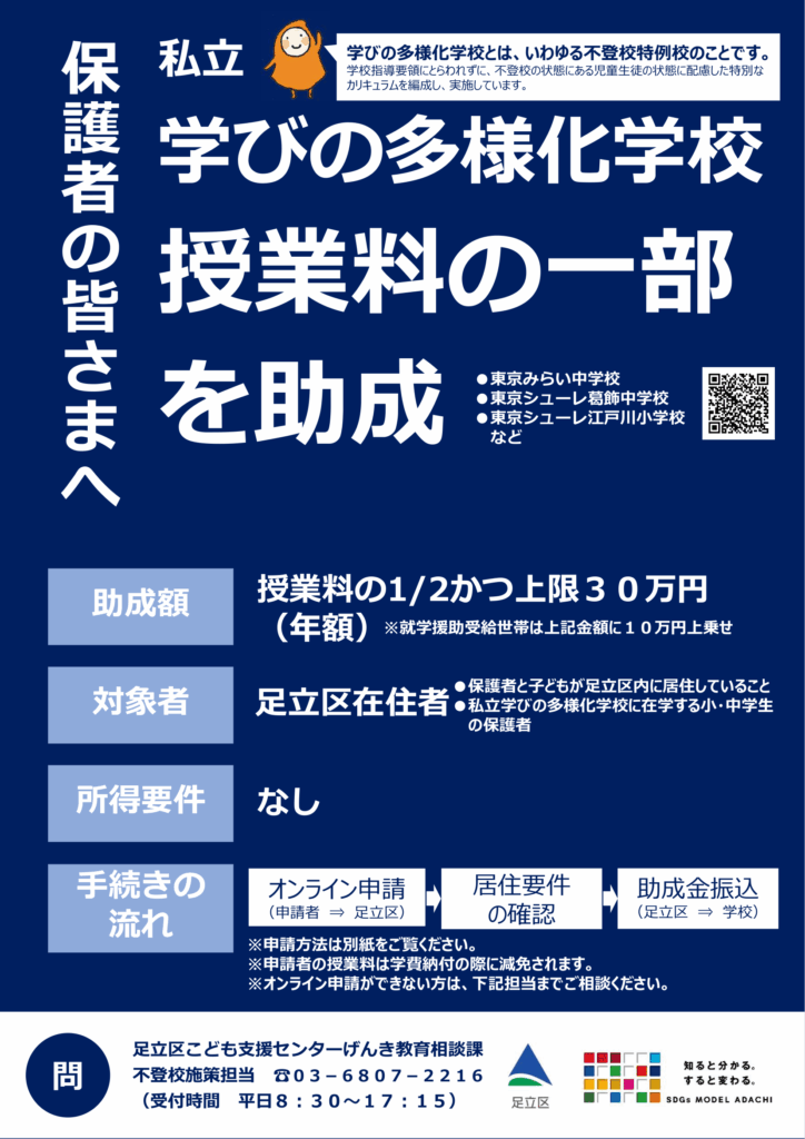 東京都足立区では不登校児童・生徒への支援として、東京都足立区在住のご家庭に対して私立学びの多様化学校に在学する小・中学生の保護者に対する授業料の一部を助成することを予定しております。